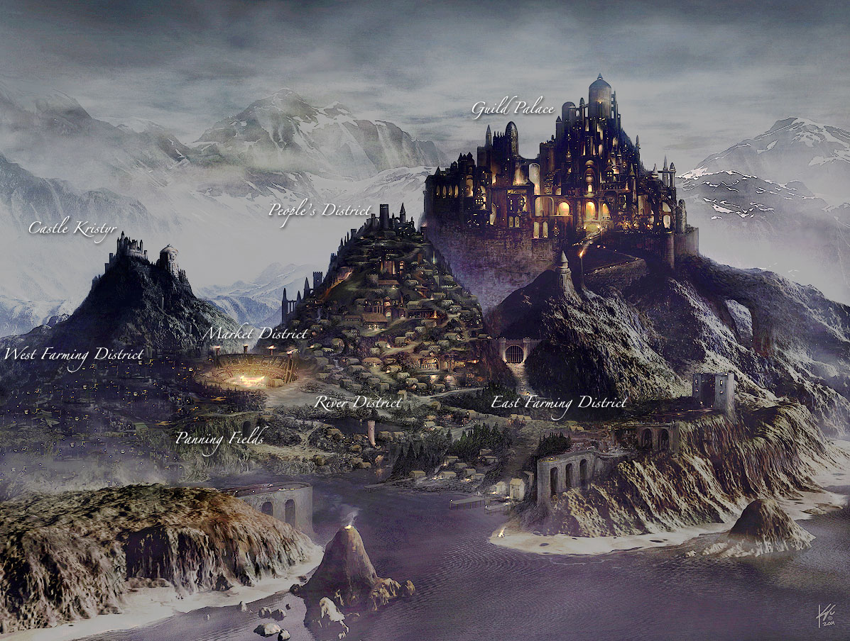 Otraxis is encircled by stone walls quarried from the black granite of the Palir Mountains, daubed in white river mud. The presence of quartz crystal in the river mud makes it white but also makes it glitter. The white daub that covers its walls is what makes Otraxis literally “the Jewel of the North”.